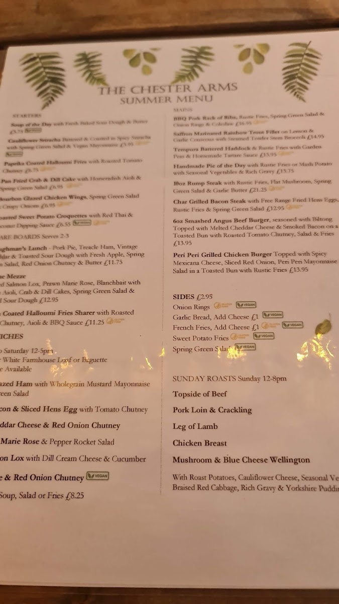 What sets The Chester Arms Menu apart is not just the quality of ingredients but the evident care in preparation and presentation. Portions are generous without sacrificing finesse, and seasonal ingredients shine through - a testament to the chef’s commitment to freshness and locality. Vegetarians and those with dietary restrictions are well-catered for, which reflects a welcome inclusivity.